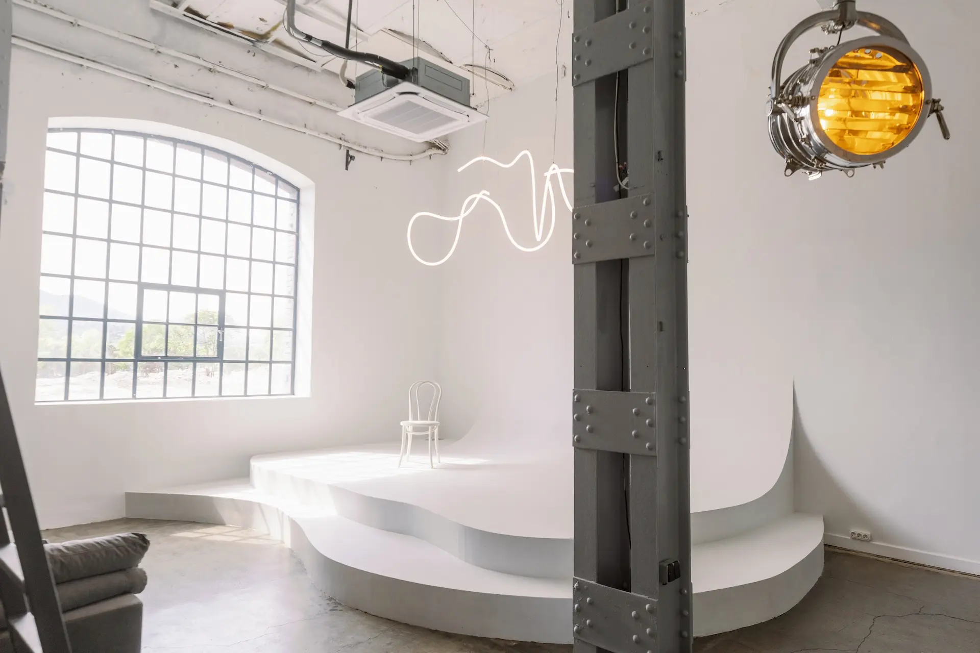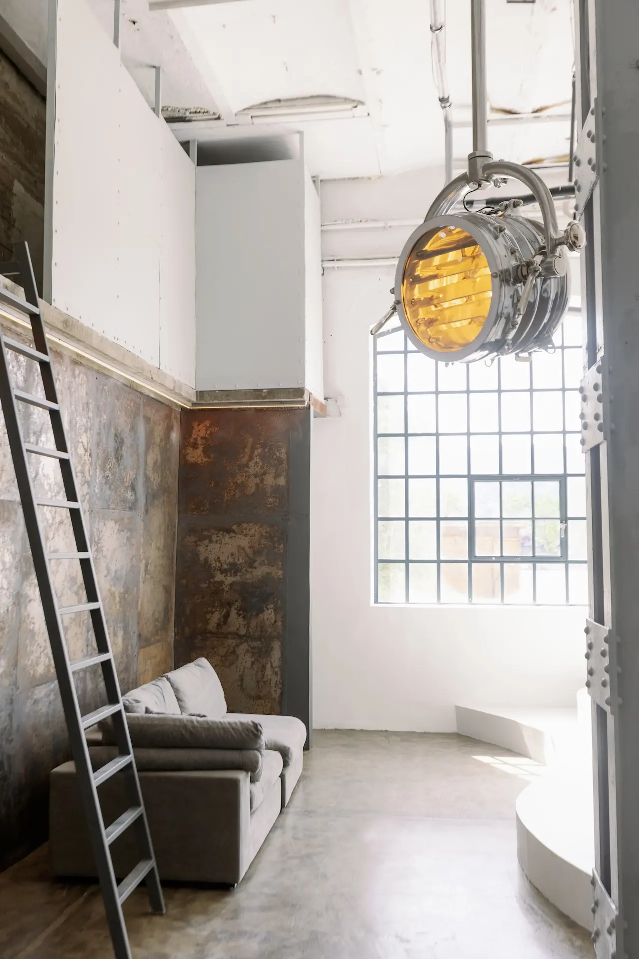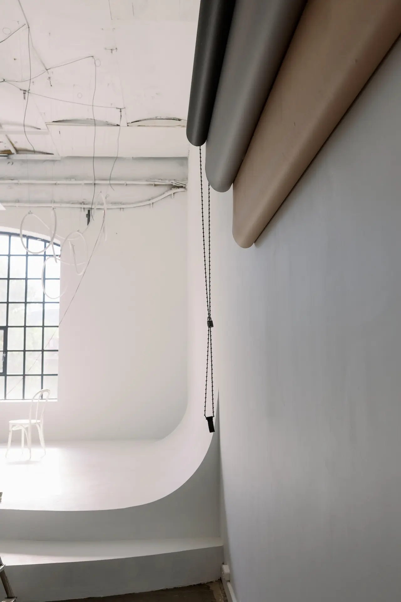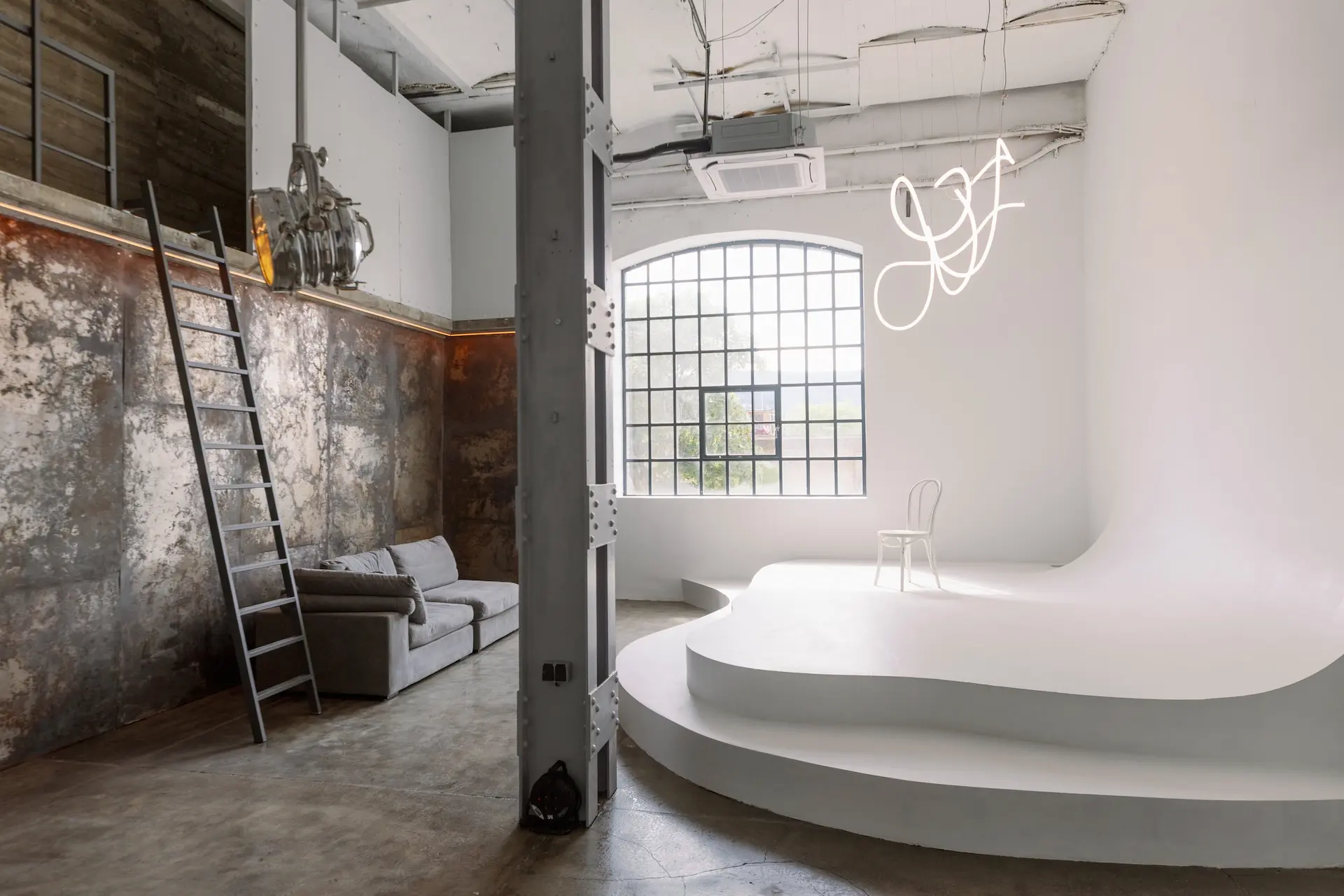 Our room: Infinity is Studio Madison’s newest space. It comes with a clean, characterful design of 73 sqm. The white curved podium, white infinity background and white walls bring in plenty of light. Paper backdrops have also been relocated here, placed in a comfortable corner. Creative backgrounds, a large armchair and sofa were also included if you’re not just taking photos with minimal backgrounds. Coloured concrete wall, special antiqued iron sheet wall, natural birch branches are the backdrops on this side.
